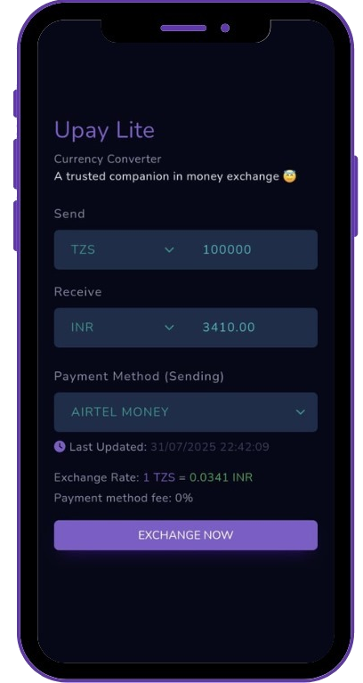 Seamlessly connect Tanzania and India with our cutting-edge technology. ⚡ Instant Transfers: Experience lightning-fast transactions at your fingertips. 🔒 Secure & Reliable: Your money's safety is our top priority. 📱 User-Friendly Interface: Intuitive design for effortless navigation. 💬 24/7 Support: We're here for you, day and night.